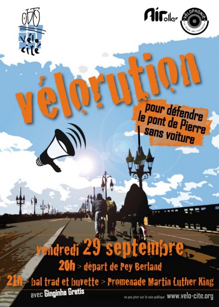 Vendredi 29 septembre 2017, 20h à la place Pey Berland, départ de la Velorution pour le Pont de Pierre sans voitures.