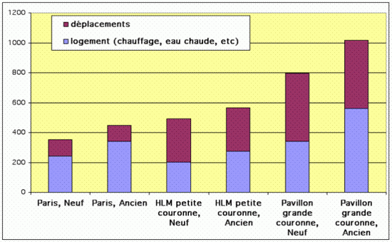 Ces chiffres disent que plus un logement est petit et neuf, mieux il est thermiquement isolé et moins il y a à chauffer. C’est le cas du HLM neuf, 200 kg de carbone par an et par personne, à comparer au pavillon de grande couronne à plus de 500 kg !. Avec l’objectif facteur 4, il faut viser 125 kgs ; nous en sommes loin, il va falloir investir énormément en isolation pour réhabiliter les logements existants.