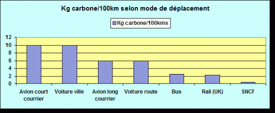 Le plus économe est le train, ou le tram, qui ne consomme que 0,3 kg de carbone aux 100 car notre production électrique utilise très peu de carburants fossiles.