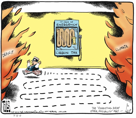 L'honneteté intellectuelle nous oblige à préciser que la taxe carbone proposée par taca (et idem pour Jim Hansen) n'aurait aucun impact direct sur le déficit public car ses recettes seront redistribuées équitablement entre chaque être humain. Donc le meilleur cartoon sur la taxe carbone reste celui sur notre page humour (et toujours du brillantissime Toles).