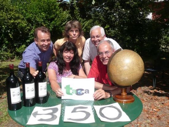Le décryptage de la photo (juin 2008) est le suivant: avec 3 bouteilles de bordeaux, les 5 fondateurs de taca et le O du globe terrestre supportent 3 5 0.