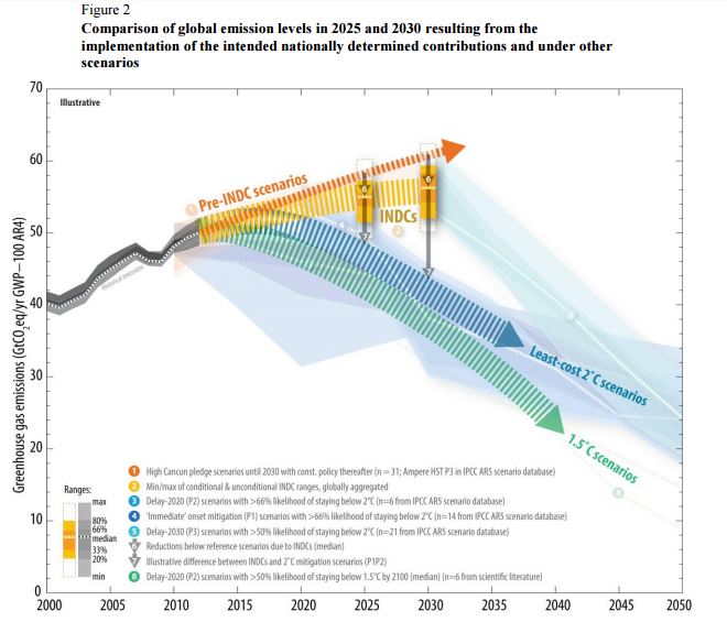 Les contributions volontaires des états, si elles sont tenues se traduiraient par une augmentation des émissions de +16% entre 2010 et 2030, à comparer aux +24% entre 1990 et 2010! On est encore bien loin de la division par 2 recherchée. Les citoyens doivent se mobiliser si on veut serieusement traiter ce problème.