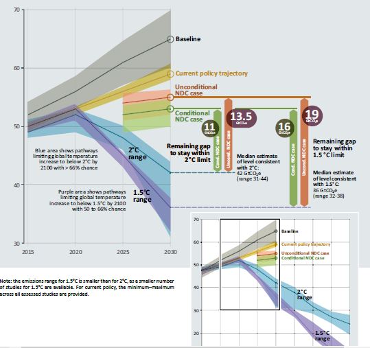 Il montre l'évolution des émissions annuelles de tous les gaz à effet de serre (en milliars de tonnes de CO2 équivalent sur l'axe vertical) à partir de 2015 et jusqu'en 2030 etape intermediaire clé par rapport à l'objectif 2050 rappelé dans le tableau du bas à droite. Baseline, en gris, c'est l'évaluation (avec les marges d'incertitude) sans aucun changement des politiques en place en 2015. En jaune c'est l'évaluation avec les politiques actuelles, en rose l'évaluation avec la prise en compte des engagements volontaires des pays (et en vert on prend aussi en compte des engagements sous conditions). Le problème c'est l'écart avec la courbe bleu compatible sous +2°C, et encore plus crucial avec la courbe violette necessaire pour rester sous +1,5°C.