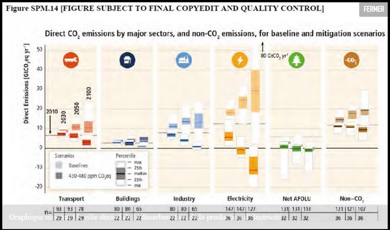 Par secteur d'activité émetteur de CO2 on voit l'évolution des émissions selon la tendance actuelle (en couleur claire) pour 2050 et 2100, à comparer avec l'évolution selon le plan du GIEC (en couleur foncée). Où se trouve le grand écart? Pour la production d'électricité, 40 milliards de tonnes CO2 en moins par an (soit les emissions annuelles actuelles de CO2), et avec en plus, en regardant de plus pres, le scoop, les centrales électriques du futur vont émettre MOINS 10 milliard de tonnes de CO2. C'est quoi ce miracle? Eh bien c'est ecrit dans le document, ce sera à base de généralisation de l'utilisation de biomasse pour produire l'electricité PLUS la capture et sequestration du CO2 (CSC) émis par ces centrales (ainsi le CO2 qui nourrit la biomasse sera ainsi effectivement enlevé de l'atmosphère).