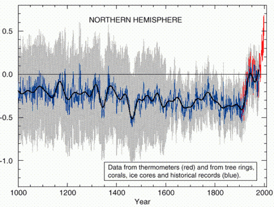 Le graphe ci dessous représente l'évolution de la température (T°) moyenne dans l'hémisphère Nord) depuis l'an 1000 jusqu'à nos jours. Cette évolution est comparée à la T° moyenne en 1990.