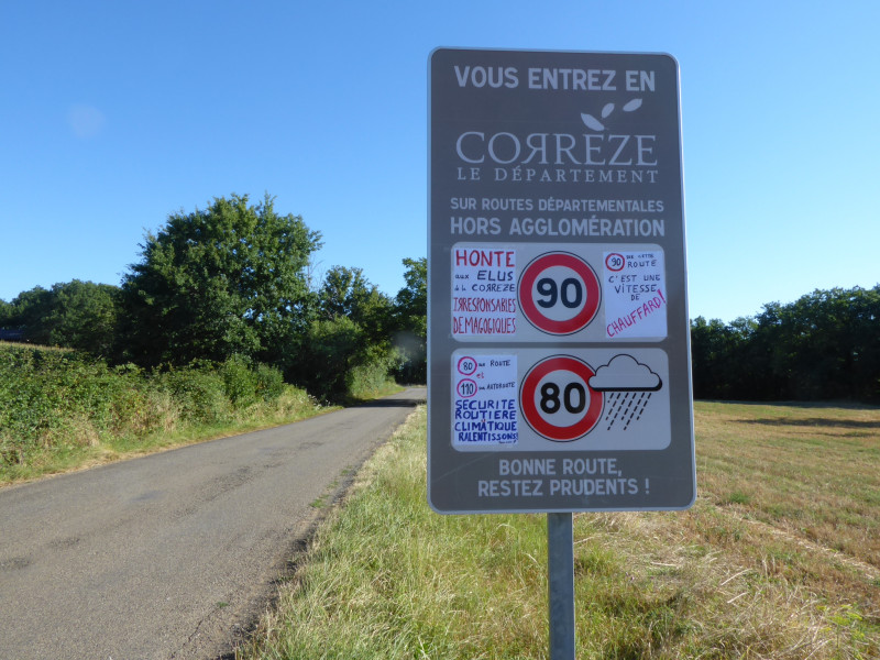 Le Département de la Correze a installé sur toutes ses routes départementales entrante en Correze ces panneaux relevant la vitesse limite à 90. L'occasion de ce petit coup de gueule et de rappeler l'interet commun pour notre securité routiere ET climatique, 80 sur Route et 110 sur Autoroute (comme proposé par la convention citoyenne pour le climat et joyeusement abandonné en rase campagne).