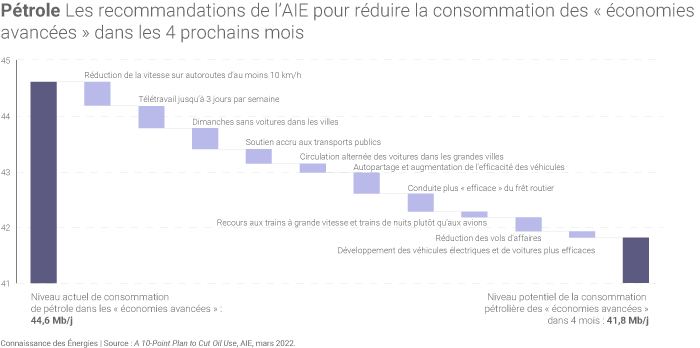 23 mars 2022 Ce graphique est extrait du rapport de l'Agence Internationale de l'Energie publié debut mars 2022 pour reduire mondialement la consommation de pétrole afin de ne plus en acheter à la Russie. On voit (si on a de bons yeux) que la réduction de vitesse sur autoroute est la mesure à court terme la plus efficace.
