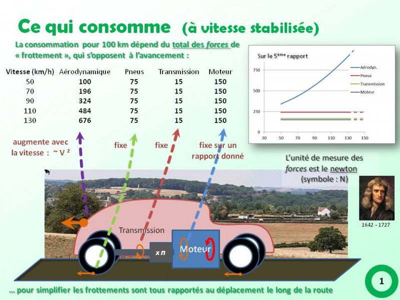 Un bon schéma vaut mieux qu'un long discours: plus la voiture va vite plus la force aerodynamique est la principale force de frottement. Réduire sa vitesse sur autoroute de 130km/h à 110 km/h économise au moins 1l de carburant aux 100 kms.