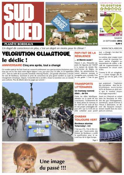 24 septembre 2011. Première VELORUTION CLIMATIQUE à Bordeaux avec en prime SUD OUED, c'est le journal que taca a révé et réalisé à l'occasion de la journée mondiale Moving Planet du 24 septembre 2011. Voici l'image de la UNE!