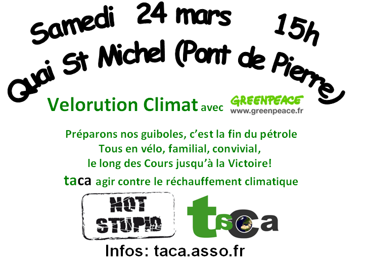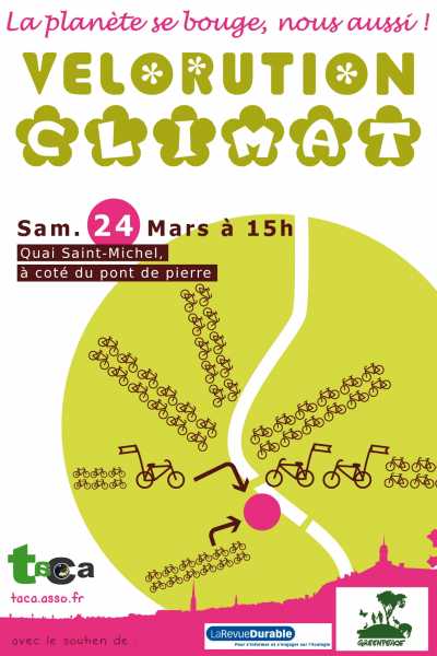 Merci de venir participer à l'organisation et l'animation de cette Velorution Climat organisée avec GreenPeace en écrivant à contact@taca.asso.fr.