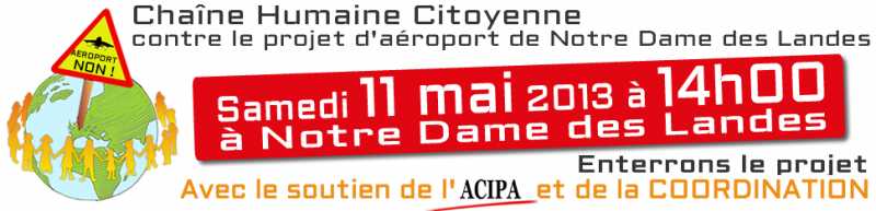 Samedi 11 mai 2013 à partir de 14h. Chaine humaine sur le site pour enterrer le projet d'aeroport (un aeroport enterré est non seulement difficile à construire, il empêche aussi tout décollage ou aterrissage d'avion, ce qui est notre objectif). Merci de diffuser l'information et d'organiser le voyage pour participer à cette chaine.