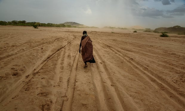 A woman walks across a dry riverbed in Turkana, Kenya. Photograph: Jennifer Huxta for the Guardian