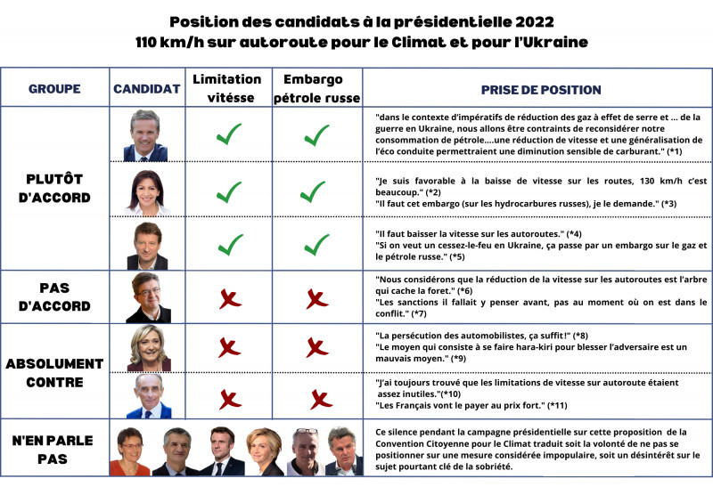 5 avril 2022 Que pensent les 12 candidats à la présidentielle du 110 km/h sur autoroute pour le Climat et l'Ukraine? Ci dessus le visuel récapitulatif et voici l'ensemble du rapport qui permet d'acceder aux references (*n) des prises de position des candidats. Un grand Merci à notre stagiaire Marina pour sa contribution à ce rapport.